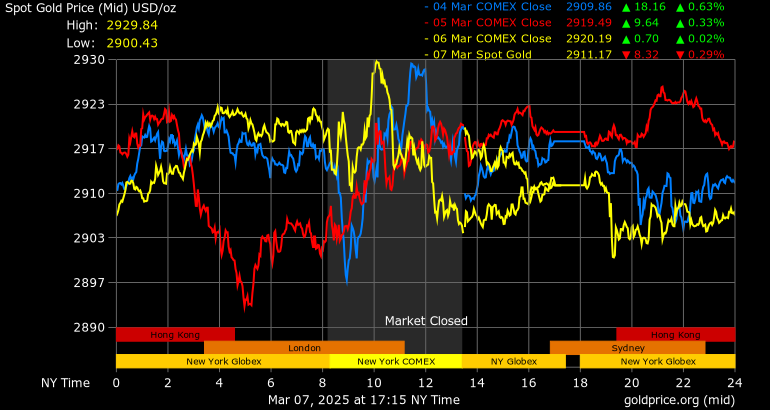 Trên thị trường vàng thế giới, giá vàng giao ngay chốt phiên hôm qua tại Mỹ giảm nhẹ 1,6 USD xuống 2.909,6 USD/ounce.