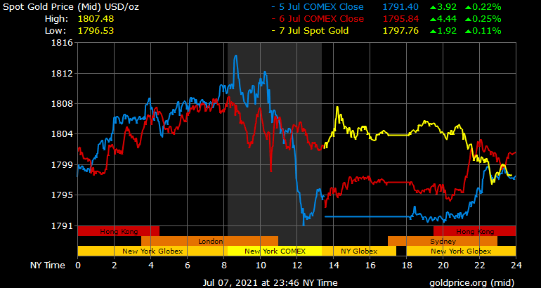 Trên thị trường vàng thế giới, giá vàng giao ngay chốt phiên đêm qua tại Mỹ tăng 6,9 USD lên 1.803,4 USD/ounce. Sang phiên châu Á sáng nay, giá vàng đảo chiều giảm xuống dưới 1.800 USD/ounce.