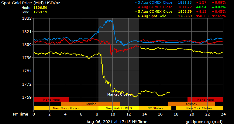 Giá vàng thế giới phiên ngày thứ Sáu bị bán tháo mạnh, do ảnh hưởng bởi chứng khoán, đồng USD và lợi suất trái phiếu Mỹ đều tăng cao, sau khi dữ liệu việc làm tháng 7 tích cực mới được công bố của Mỹ không chỉ hỗ trợ cho sự phục hồi kinh tế mạnh mẽ, mà một số nhà phân tích còn cho rằng, điều này sẽ thúc đẩy Fed đưa ra kế hoạch giảm lượng mua trái phiếu vào đầu năm 2022.