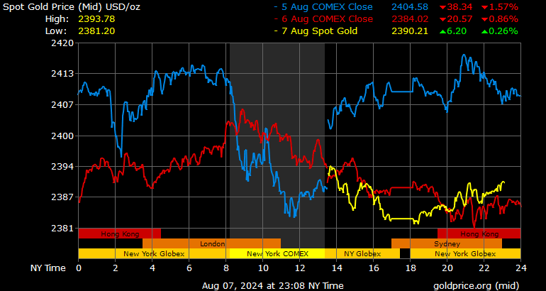 Trên thị trường vàng thế giới, giá vàng giao ngay chốt phiên hôm qua tại Mỹ giảm 7,2 USD xuống 2.382,9 USD/ounce. Sang phiên châu Á sáng nay, giá vàng đảo chiều tăng 7,4 USD lên 2.390,3 USD/ounce.