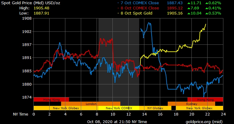 Trên thị trường vàng thế giới, giá vàng giao ngay chốt phiên đêm qua tại Mỹ tăng 7,1 USD lên 1.893,9 USD/ounce. Sang phiên châu Á sáng nay, giá vàng tăng nhanh lên gần 1.905 USD/ounce. Giá vàng tương lai giao tháng 11 trên sàn Comex New York tăng 13,5 USD lên 1.904,5 USD/ounce.