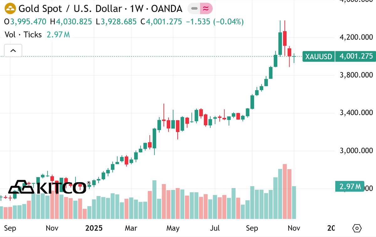 Ngưỡng 4.000 USD/ounce vẫn là ngưỡng tâm lý quan trọng đối với thị trường vàng, vì giá vàng có khả năng đóng cửa quanh mốc này tuần thứ hai liên tiếp. Giá vàng giao ngay kết thúc tuần ở trên mức 4.001 USD/ounce, giảm chưa đến 1 USD so với giá đóng cửa tuần trước.