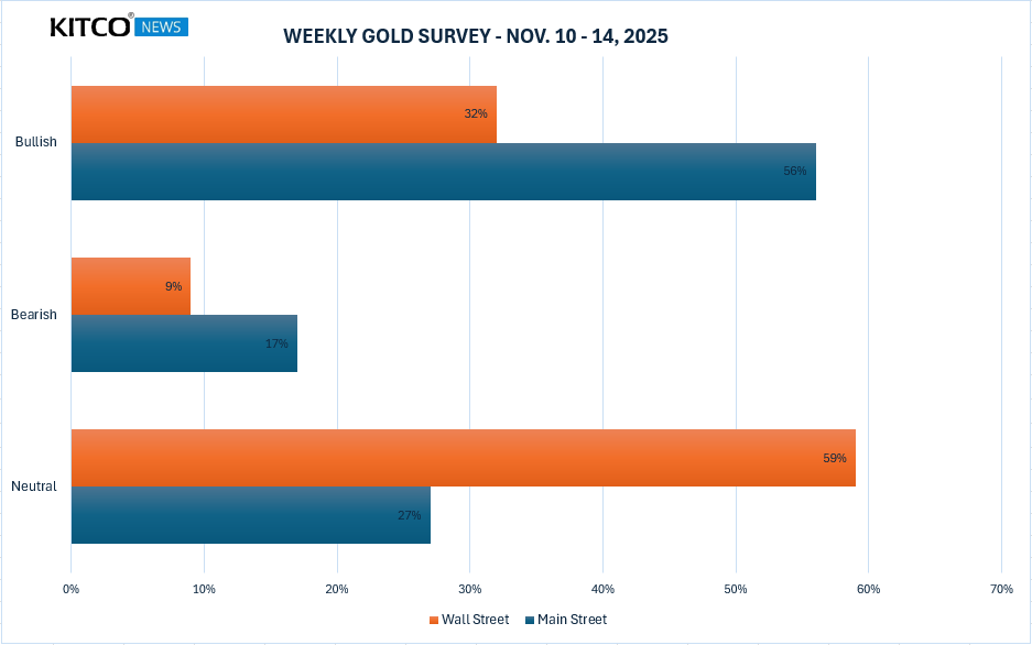 Tuần này, 21 nhà phân tích Phố Wall đã tham gia Khảo sát Vàng của Kitco News. Trong số những người tham gia, 13 nhà phân tích, tương đương 59%, giữ quan điểm trung lập về vàng trong ngắn hạn. Đồng thời, bảy nhà phân tích, tương đương 32%, lạc quan về giá vàng tuần tới, trong khi hai nhà phân tích, tương đương 9%, dự đoán giá sẽ giảm. Trong khi đó, 221 phiếu bầu đã được bỏ trong cuộc thăm dò trực tuyến trên mạng xã hội.