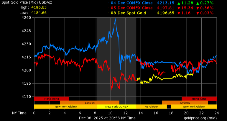 Trên thị trường vàng thế giới, giá vàng giao ngay chốt phiên hôm qua tại Mỹ giảm 8,0 USD, tương ứng giảm 0,19% xuống mức 4.190,7 USD/ounce. Sang phiên châu Á sáng nay, giá vàng đảo chiều tăng 6,1 USD lên 4.196,7 USD/ounce.