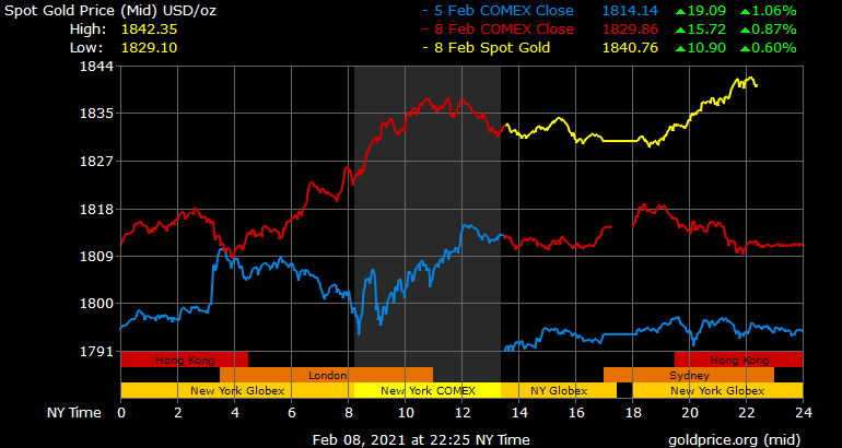 Giá vàng tương lai giao tháng 3 trên sàn Comex New York tăng 8,6 USD lên 1.841,6 USD/ounce.