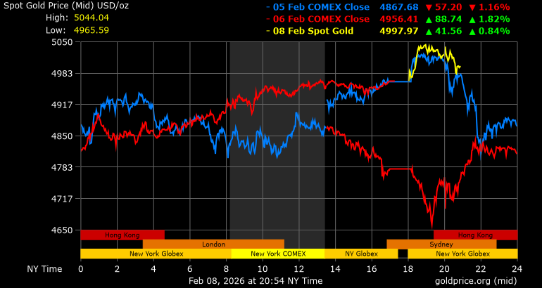 Trên thị trường vàng thế giới, giá vàng giao ngay chốt phiên cuối tuần qua tại Mỹ tăng 183,9 USD, tương ứng tăng 3,85% lên mức 4.964,6 USD/ounce. Sang phiên châu Á sáng nay, giá vàng tiếp tục tăng 32,4 USD lên mức 4.997,1 USD/ounce.