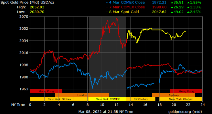 Giá vàng tương lai giao tháng 4/2022 trên sàn Comex New York tăng 11 USD lên 2.061,3 USD/ounce.