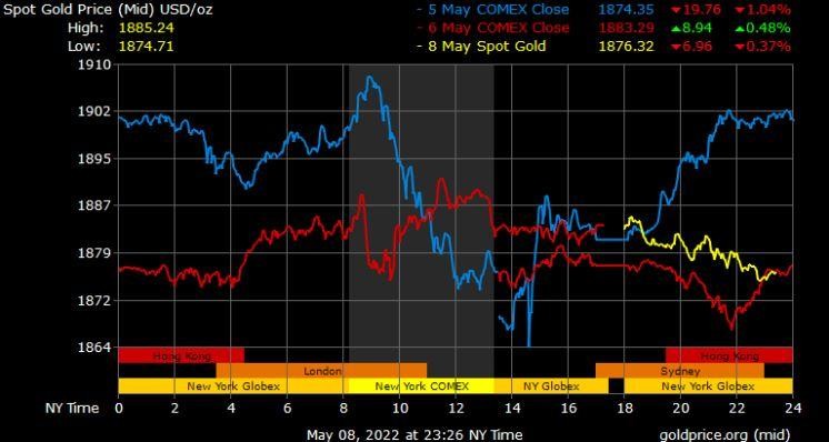 Giá vàng tương lai giao tháng 6/2022 trên sàn Comex New York tăng 7,1 USD lên mức 1.882,8 USD/ounce.