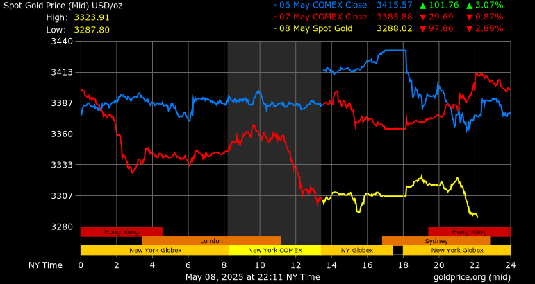 Giá vàng tương lai giao tháng 6/2025 trên sàn Comex New York giảm 85,9 USD, tương ứng giảm 2,53% xuống mức 3.306 USD/ounce.