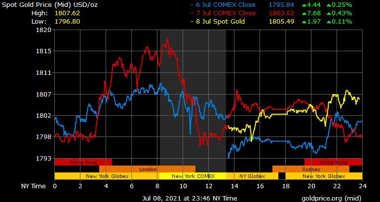 Giá vàng tương lai giao tháng 8 trên sàn Comex New York tăng 4,6 USD lên 1.804,8 USD/ounce.