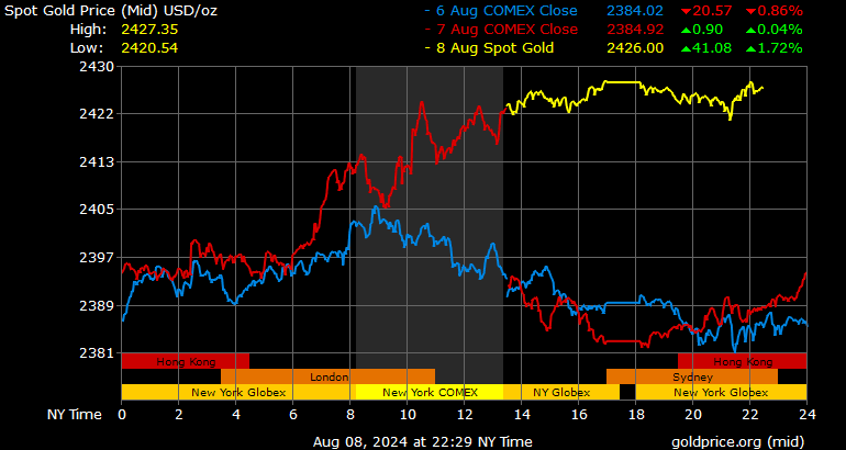 Vàng tăng vọt khi số đơn xin trợ cấp thất nghiệp hàng tuần của Hoa Kỳ giảm mạnh so với dự báo, xuống còn 233.000, điều này làm cho nhà đầu tư lo ngại về sự suy thoái của nền kinh tế lớn nhất thế giới. Đồng thời, thị trường gia tăng kỳ vọng Mỹ sẽ cắt giảm lãi suất đáng kể vào tháng 9.