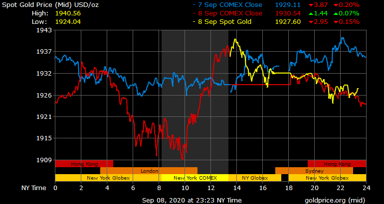 Trên thị trường vàng thế giới, giá vàng giao ngay chốt phiên đêm qua tại Mỹ tăng 0,9 USD lên 1.931 USD/ounce. Sang phiên châu Á sáng nay, giá vàng giảm xuống gần 1.927 USD/ounce. Giá vàng tương lai giao tháng 10 trên sàn Comex New York giảm 8,5 USD xuống 1.926,6 USD/ounce.
