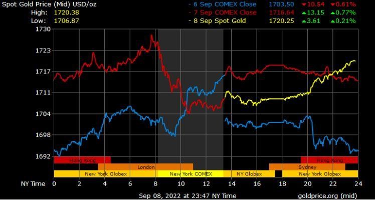 Giá vàng tương lai giao tháng 10/2022 trên sàn Comex New York giảm 7,6 USD lên 1.710,6 USD/ounce.