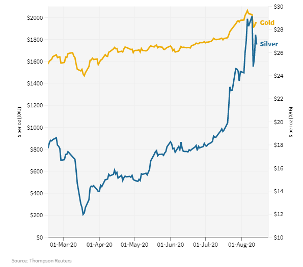 Ví dụ, trong tháng 3 khi các thị trường bán tháo để chuyển sang tiền mặt, bạc đã giảm tới 30% và về giao dịch mức 12 USD/ounce. Trong khi đó, cùng thời điểm giá vàng chỉ giảm 11% về 1.470 USD/ounce.