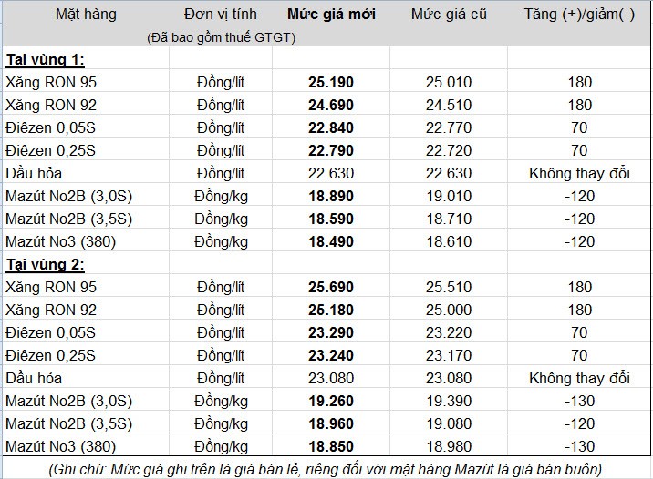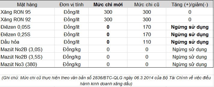 Cũng từ 12h trưa nay, Bộ Tài chính cũng có quyết định ngừng sử dụng Quỹ Bình ổn giá đối với dầu diezen và dầu hỏa, theo văn bản số 3458/BTC-QLG ngày 19/3/2014. Cụ thể: