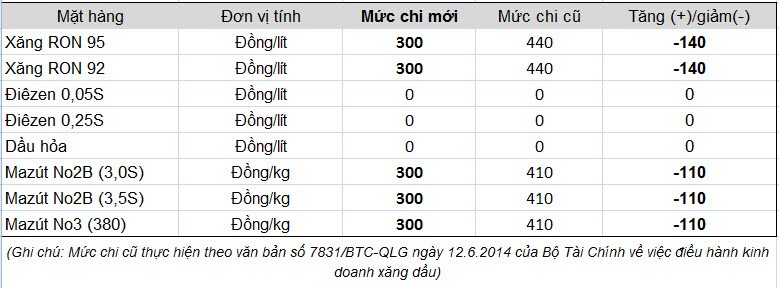 Cũng trong ngày 23/6, Bộ Tài chính cũng có văn bản giảm mức chi sử dụng Quỹ Bình ổn giá (BOG), cũng áp dụng từ 20h ngày 23/6/2014. Cụ thể: