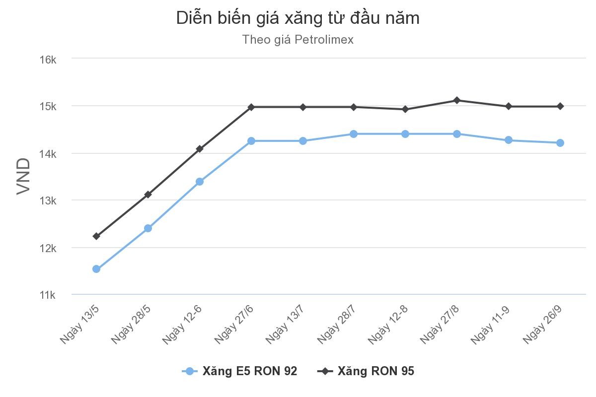 Ngày 26/9, cơ quan quản lý đã điều chỉnh xăng E5RON92 giảm 51 đồng một lít, về tối đa 14.215 đồng; dầu diesel giảm 390 đồng, tối đa còn 11.218 đồng; dầu hoả cũng hạ 144 đồng, còn 9.449 đồng và dầu madut tối đa 10.826 đồng một kg, tương đương mức giảm 117 đồng.