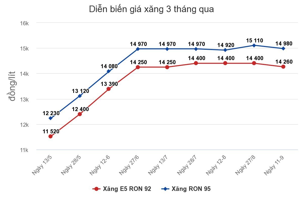Tại kỳ điều hành ngày 11/9, mỗi lít xăng E5 RON 92 giảm 143 đồng, xăng RON 95 hạ 130 đồng. Các mặt hàng dầu giảm nhiều hơn, như dầu hoả giảm 532 đồng mỗi lít; dầu diesel hạ 443 đồng và madut cũng thấp hơn 240 đồng một kg so với kỳ điều hành cuối tháng 8.