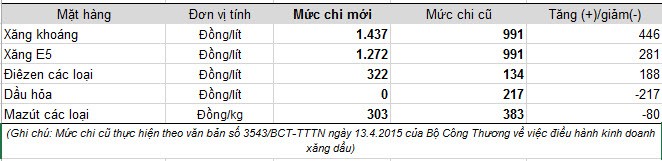 Ngày 5/5, Liên bộ Tài chính - Công thương đã có công văn gửi các thương nhân đầu mối kinh doanh xăng dầu về việc điều hành kinh doanh xăng dầu. Theo quyết định của Liên bộ, tăng chi sử dụng Quỹ Bình ổn giá xăng dầu để hỗ trợ mặt hàng xăng khoáng từ 991 đồng/lít lên 1.437 đồng/lít và xăng E5 là 1.272 đồng/lít. Sau khi chi sử dụng Quỹ bình ổn giá xăng dầu để hỗ trợ, giá bán lẻ 2 loại xăng sẽ cùng được điều chỉnh cùng tăng 1.950 đồng/lít.