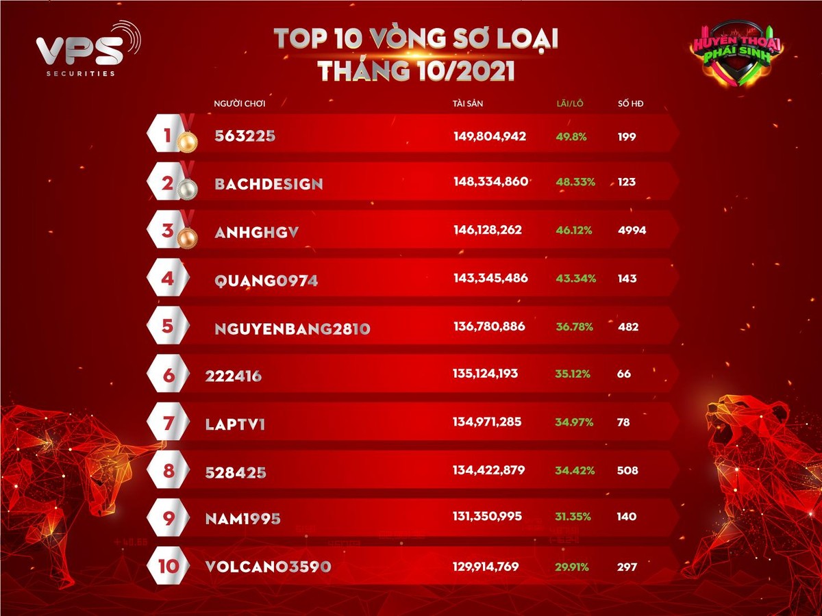 (ĐTCK) Giải đấu Huyền thoại phái sinh của Công ty cổ phần Chứng khoán VPS (VPS) tiếp tục nhận được sự tham gia, hưởng ứng nhiệt tình từ các chứng thủ và đã tìm ra 10 cái tên xuất sắc nhất của vòng Sơ loại tháng 10/2021.