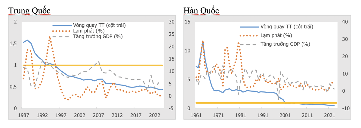 Theo đó, ông Lân chia sẻ, vòng quay tiền được xem như một chỉ báo phản ánh mức độ ổn định kinh tế vĩ mô. Thông thường, vòng quay tiền tệ tăng cao và mạnh là chỉ dấu của nền kinh tế tăng trưởng nóng và/hoặc đang có lạm phát cao, chứ không phải là dấu hiệu của nền kinh tế lành mạnh. Nhìn lại lịch sử, trong thời kỳ lạm phát cao và bất ổn kinh tế vĩ mô, vòng quay tiền tệ luôn lớn hơn 1.
