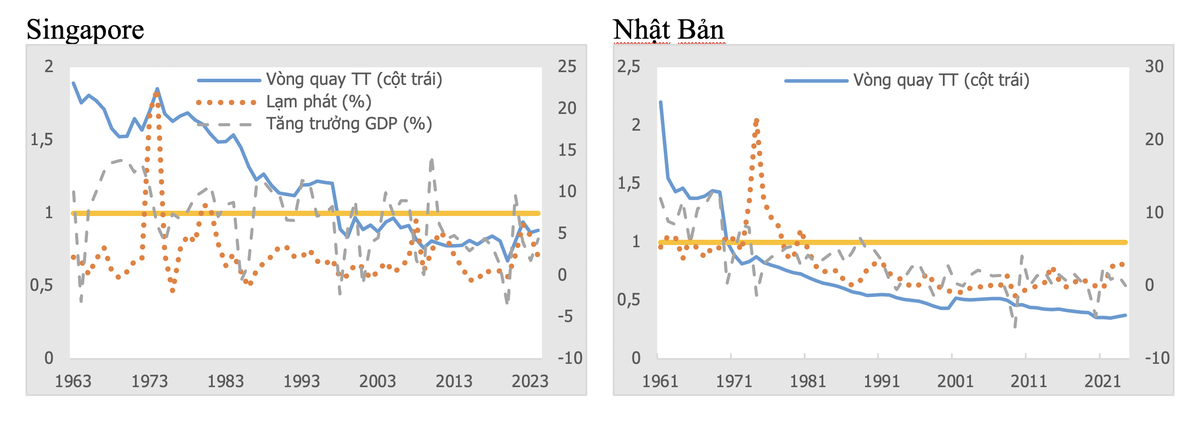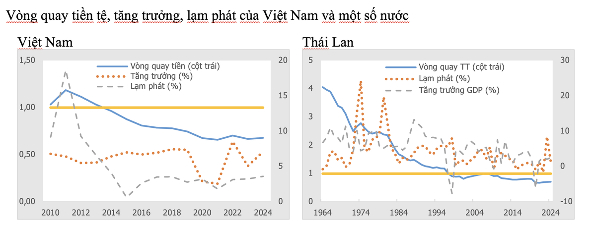 Trong cả giai đoạn từ năm 2014 đến nay, vòng quay tiền tệ <1 và tương đối ổn định, đi kèm với giai đoạn lạm phát được kiểm soát tốt, góp phần ổn định kinh tế vĩ mô, thúc đẩy hoạt động sản xuất, kinh doanh, hỗ trợ tăng trưởng kinh tế (Năm 2024, vòng quay tiền tệ là 0,68 lần, tăng trưởng kinh tế đạt 7,09%, lạm phát là 3,6%). Hiện nay, vòng quay tiền tệ của Việt Nam hiện nay (2024) đạt 0,68 lần/năm, cao hơn mức 0,4 lần/năm của Trung Quốc, Nhật Bản, tương đồng với mức 0,7 lần/năm của Thái Lan.