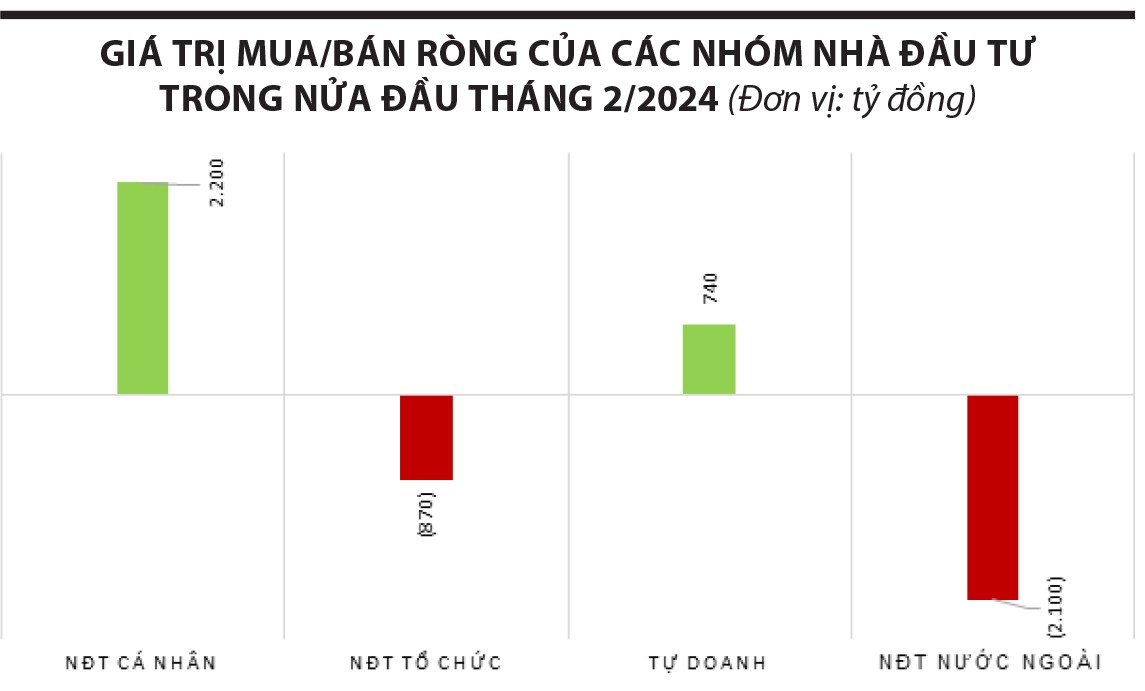 Mức tăng của VN-Index trong tuần qua là 16,43 điểm (+1,3%), với sự dẫn dắt của nhóm nhà đầu tư cá nhân trong nước và tự doanh công ty chứng khoán khi giá trị mua ròng lần lượt là 1.050 tỷ đồng và 440 tỷ đồng. Tính chung, trong nửa đầu tháng 3/2024, nhà đầu tư cá nhân trong nước là bên mua trọn vẹn giá trị bán ròng khoảng 2.000 tỷ đồng của nhà đầu tư nước ngoài. Có thể nói, thị trường hiện tại đang là cuộc chơi của các cá nhân trong nước.