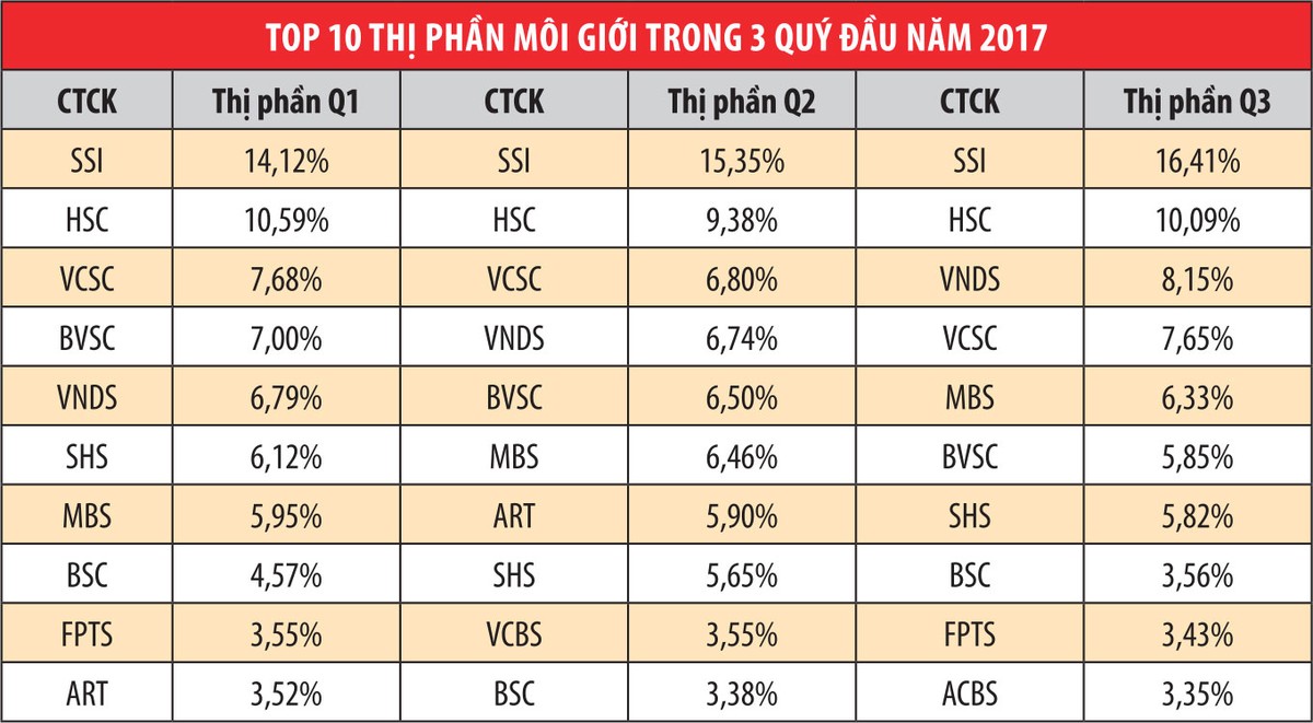 Theo công bố thị phần môi giới từ quý III/2017 từ Sở Giao dịch chứng khoán TP.HCM, SSI và HSC tiếp tục ở trong top đầu. Không những vậy, thị phần còn tăng thêm lần lượt 1,06% và 0,7% so với quý II. Ở vị trí thứ 3 và 4, dù tăng lên về thị phần, nhưng có sự thay đổi vị trí, VNDS lọt Top 3, còn VCSC ở vị trí thứ 4. Vị trí thứ 5 vẫn thuộc về MBS. Điều này cho thấy có sự dịch chuyển khách hàng từ các công ty chứng khoán top dưới sang các công ty chứng khoán hàng đầu.
