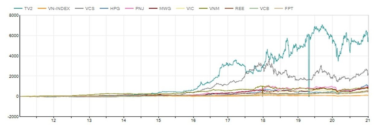 TV2 tăng 54,8 lần, CAGR 49,2%/năm. Nếu bạn đầu tư 100 triệu đồng vào TV2 10 năm trước, bây giờ bạn có 5,48 tỷ đồng, các cổ phiếu khác xem trên biểu đồ. Nếu bạn gửi tiết kiệm với lãi suất 6%/năm, thì bây giờ bạn chỉ có 180 triệu đồng.