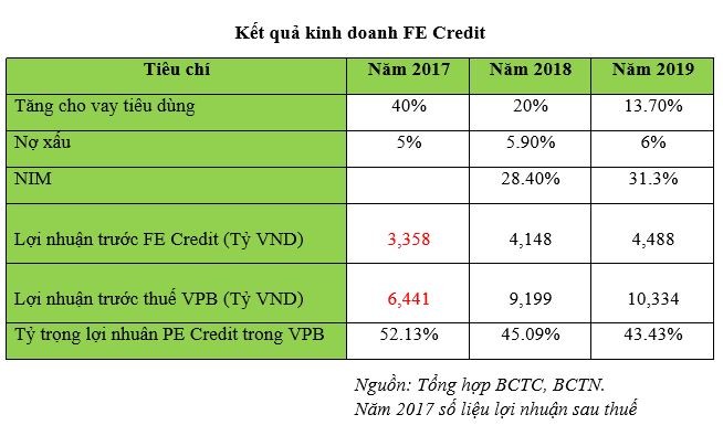 Mảng vay tiêu dùng luôn đóng góp lớn vào kết quả kinh doanh của VPB, chiếm tỷ trọng 52,13% lợi nhuận sau thuế năm 2017, năm 2018 là 45,09% và năm 2019 là 43,43%.
