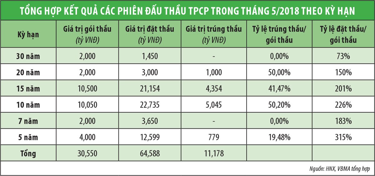 Điều đáng nói là tuy mặt bằng lãi suất trúng thầu trái phiếu trong tháng 5 vừa qua đã được đẩy lên so với tháng 4/2018, nhưng tình trạng trái phiếu ế chưa có tín hiệu được cải thiện, thậm chí mức độ ế gia tăng. Theo Sở Giao dịch chứng khoán Hà Nội (HNX), so với tháng 4/2018, lãi suất trúng thầu của trái phiếu chính phủ do Kho bạc Nhà nước phát hành tăng trên tất cả các kỳ hạn: 5 năm (tăng 0,03%/năm), 10 năm (tăng 0,16%/năm), 15 năm (tăng 0,13%/năm), 20 năm (tăng 0,02%/năm). Cụ thể, lãi suất trúng thầu của trái phiếu kỳ hạn 5 năm nằm trong khoảng 2,97 - 3%/năm, 10 năm trong khoảng 4,15 - 4,26%/năm, 15 năm trong khoảng 4,5 - 4,6%/năm, 20 năm là 5,14%/năm.