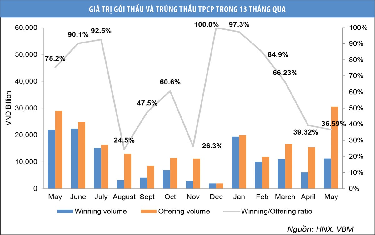 Tình trạng ế trái phiếu do Kho bạc Nhà nước phát hành tiếp diễn trong tháng 5 vừa qua, khi trong tổng giá trị gọi thầu và gọi thầu phát hành thêm là 30.550 tỷ đồng, tổng giá trị trúng thầu và trúng thầu phát hành thêm chỉ đạt 11.178 tỷ đồng, tương đương tỷ lệ trúng thầu là trên 36,5%