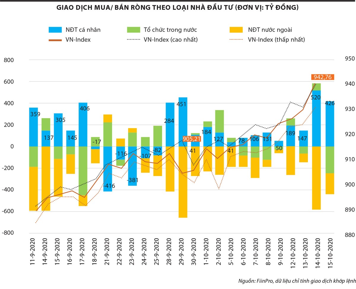Theo số liệu thống kê từ Fiintrade, nhà đầu tư cá nhân trong nước liên tiếp mua ròng từ đầu tháng 10 đến nay, đặc biệt là phiên thanh khoản kỷ lục ngày 14/10, dòng tiền nội mua ròng mạnh.