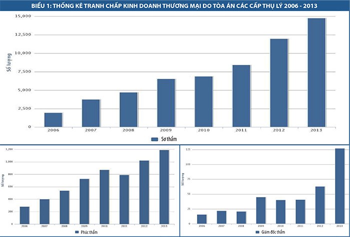 Theo số liệu của ngành Tòa án, giai đoạn 2009 - 2013, tranh chấp trong kinh doanh thương mại (án kinh tế) tăng gấp 2,25 lần từ 6.575 vụ (năm 2009) lên 14.767 vụ (năm 2013). Đáng lưu ý là 3 năm trở lại đây, án kinh tế tăng trung bình 3.000 vụ/năm (2011: 8.418 vụ; 2012: 11.995 vụ; 2013: 14.767 vụ). Tính riêng năm 2013, có khoảng 8% vụ án có kháng cáo/kháng nghị xử phúc thẩm và 0,8% có kháng nghị xử giám đốc thẩm. Số liệu so sánh giai đoạn 2006 - 2012 cũng cho thấy, chỉ có khoảng 8 - 10% vụ án có kháng cáo/kháng nghị xử phúc thẩm và 0,5 - 0,8% có kháng nghị xử giám đốc thẩm (xem biểu 1).