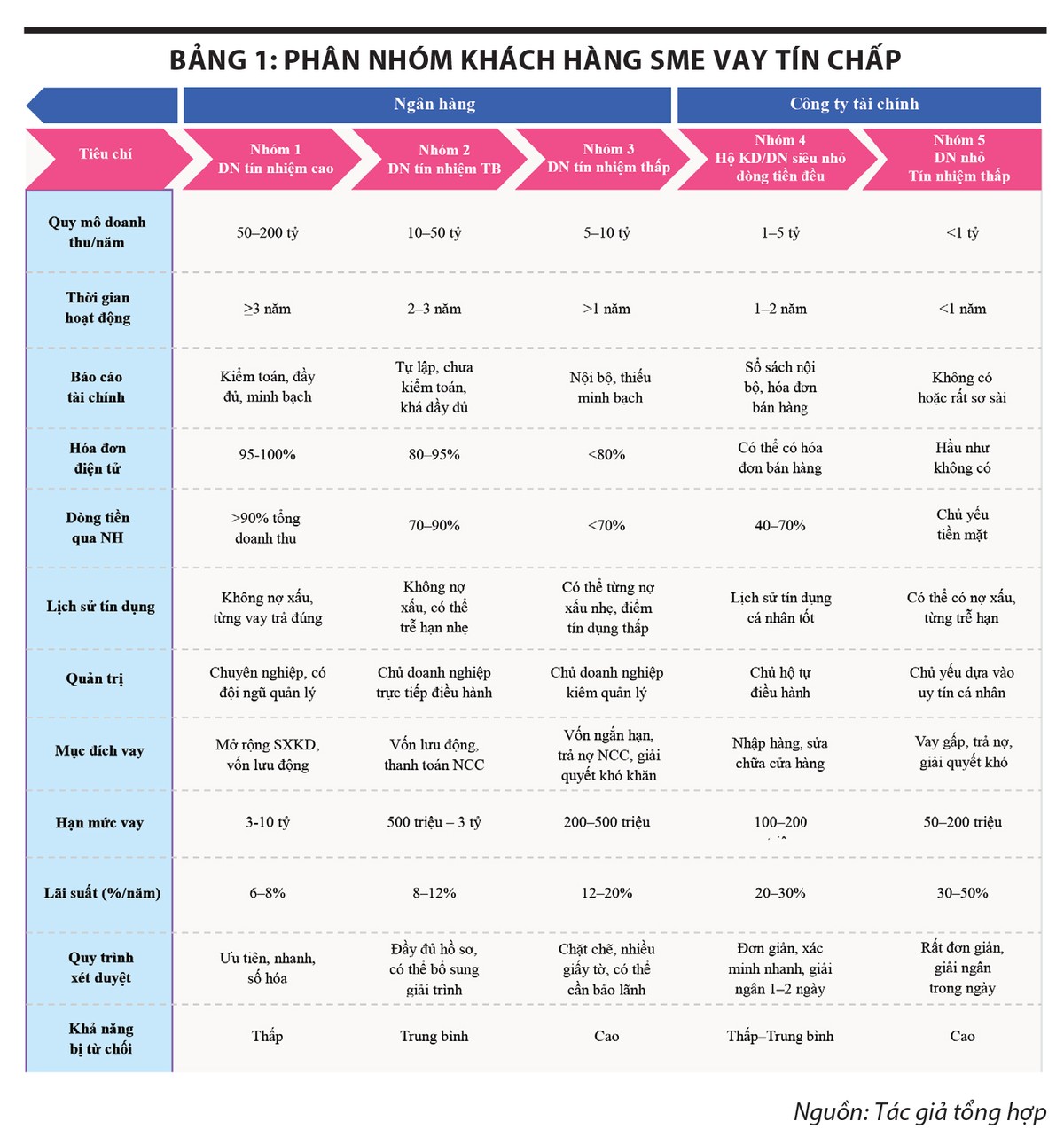 Để hình dung cách ngân hàng và công ty tài chính thiết kế sản phẩm tín chấp phù hợp riêng cho từng đối tượng, cần phác họa rõ bức tranh phân hạng khách hàng chi tiết hơn trước đây rất nhiều. Thay vì gom tất cả SME dưới một trần lãi suất chung, các tổ chức tín dụng đã xây dựng một ma trận 5 nhóm, dựa trên 5 tiêu chí chính gồm quy mô doanh thu, tuổi đời hoạt động, mức độ minh bạch của sổ sách và lịch sử tín dụng. Mỗi nhóm trong ma trận này đi kèm hạn mức vay và mức lãi suất có thể chênh lệch rất đáng kể dựa vào các doanh nghiệp khác nhau, tạo ra khoảng thưởng - phạt rất rõ ràng giữa các doanh nghiệp dựa trên mức độ minh bạch về tài chính.