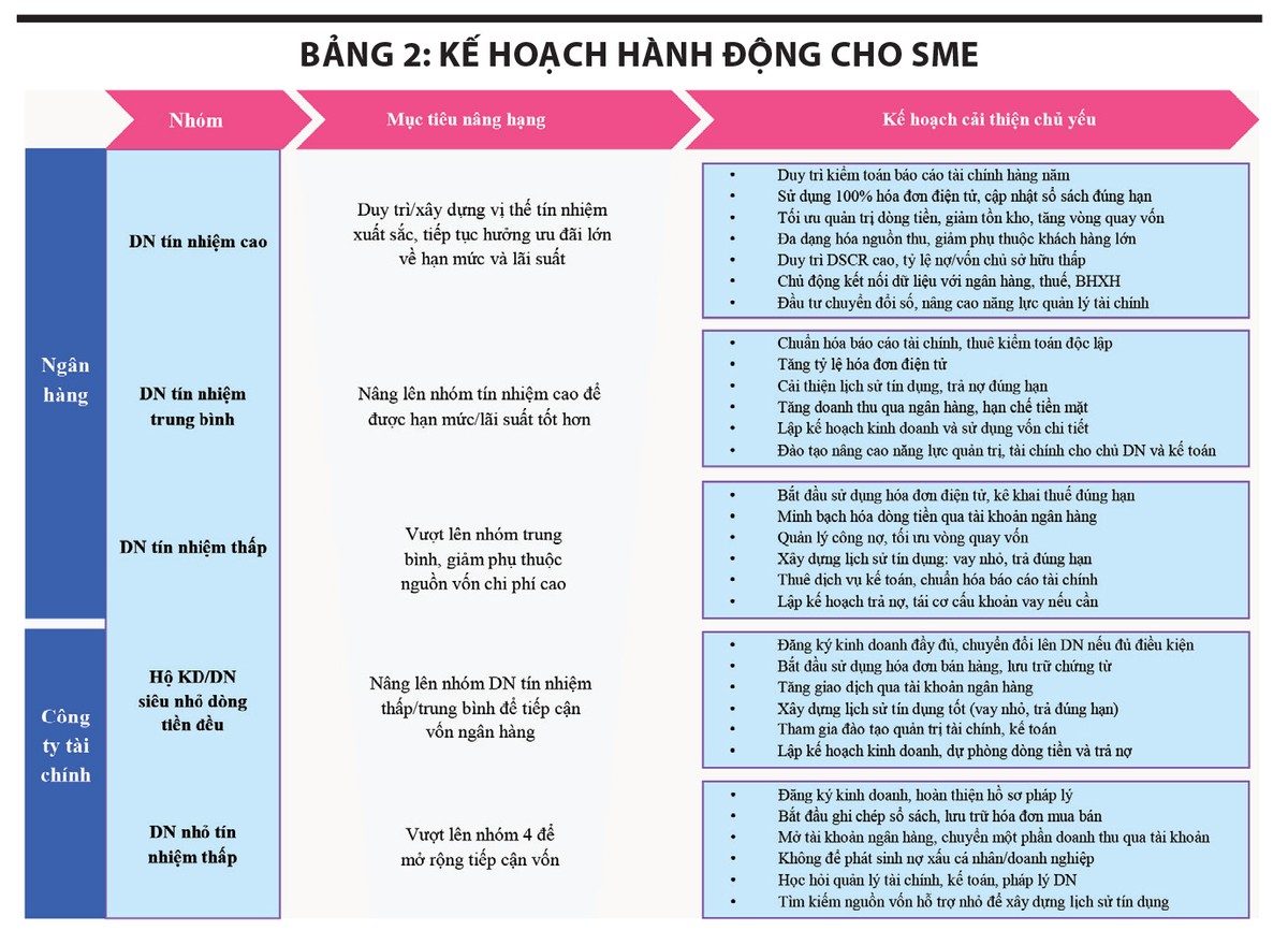 Thực tế từ nhiều doanh nghiệp cho thấy, chỉ cần duy trì kỷ luật tài chính chặt chẽ trong 12-18 tháng, một doanh nghiệp thuộc Nhóm 3 hoàn toàn có thể tiến lên Nhóm 2 và được hưởng mức lãi suất ưu đãi hơn. Bảng mô tả sẽ giúp phác thảo một bức tranh chi tiết kế hoạch hành động theo từng nhóm tín nhiệm cụ thể.