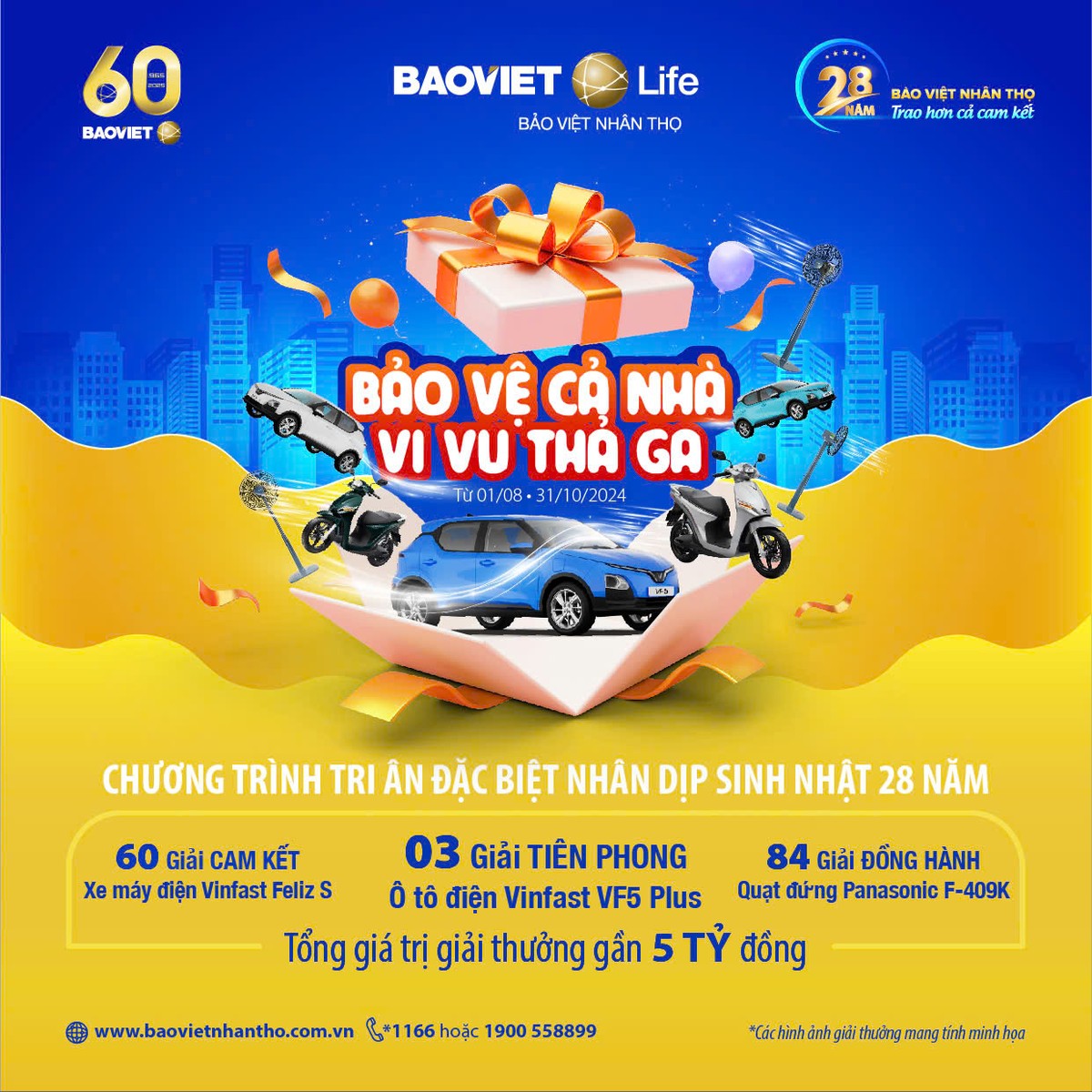 Kỷ niệm 28 năm thành lập và phát triển, Bảo Việt Nhân thọ đã triển khai chương trình tri ân lớn nhất năm “Bảo vệ cả nhà – vi vu thả ga” với các giải thưởng hướng tới lối sống xanh có tổng giá trị gần 5 tỷ đồng gồm: 3 xe ôtô điện Vinfast VF5 plus, 60 xe máy điện Vinfast Feliz S và nhiều giải thưởng giá trị khác. Chương trình diễn ra từ ngày 01/08/2024 đến hết ngày 31/10/2024 dành cho các khách hàng của Bảo Việt Nhân thọ tham gia hợp đồng mới và đáp ứng đủ các điều kiện của chương trình.