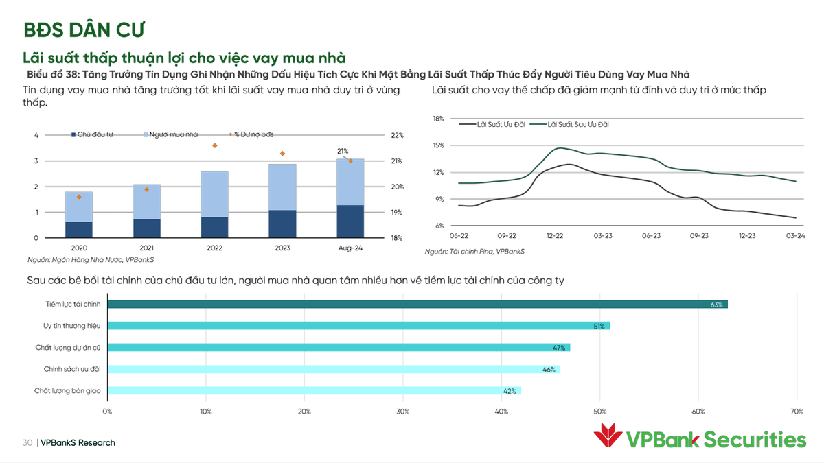 Một điểm khác theo ông Dương, là có sự phục hồi của tín dụng tiêu dùng trong lĩnh vực bất động sản. Lãi suất cho vay thế chấp dao động 7 - 9% sẽ hỗ trợ rất tốt cho quyết định đầu tư và mua bất động sản của người dân. Nếu so sánh giá cho thuê cộng với tăng giá bất động sản như một nghiên cứu của Savill thì mang lại lợi nhuận khoảng 5,5%/năm tính đến quý 2/2024. Với mức lợi nhuận này, người mua có thể chịu đựng được mức lãi suất thế chấp hiện nay.