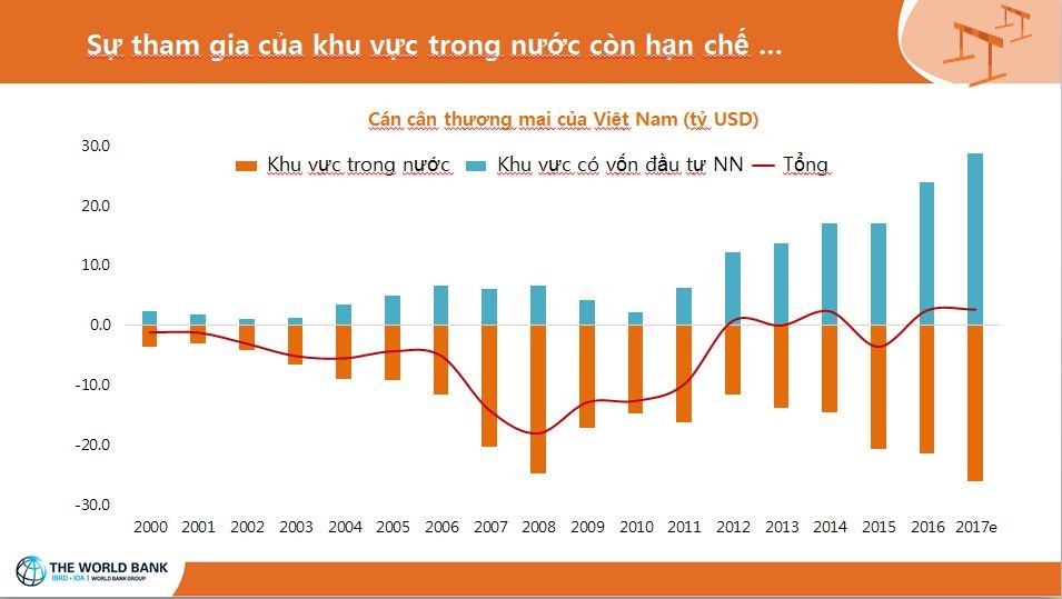Theo ông Ousmane Dione, cán cân thương mại của Việt Nam có sự đối lập giữa khu vực FDI và doanh nghiêp trong nước. Kết quả thương mại của Việt Nam có được là nhờ khu vực FDI, chiếm 70% kim ngạch xuất khẩu và đang đạt được thặng dư lớn. Trong khi, khu vực trong nước vẫn đang ghi nhận thâm hụt thương mại.