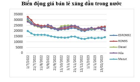 Bình quân giá thành phẩm xăng dầu thế giới giữa kỳ điều hành giá ngày 13/02/2023 và kỳ điều hành ngày 21/02/2023 là: 96.853 USD/thùng xăng RON92 dùng để pha chế xăng E5RON92 (giảm 0,158 USD/thùng, tương đương giảm 0,16% so với kỳ trước); 100.277 USD/thùng xăng RON95 (tăng 0,04 USD/thùng, tương đương tăng 0,04% so với kỳ trước); 105,952 USD/thùng dầu hỏa (giảm 5,362 USD/thùng, tương đương giảm 5,06% so với kỳ trước); 103,118 USD/thùng dầu điêzen (giảm 4,920 USD/thùng, tương đương giảm 4,77% so với kỳ trước); 414,875 USD/tấn dầu mazut 180CST 3,5S (tăng 29,586 USD/tấn, tương đương tăng 7,13% so với kỳ trước).