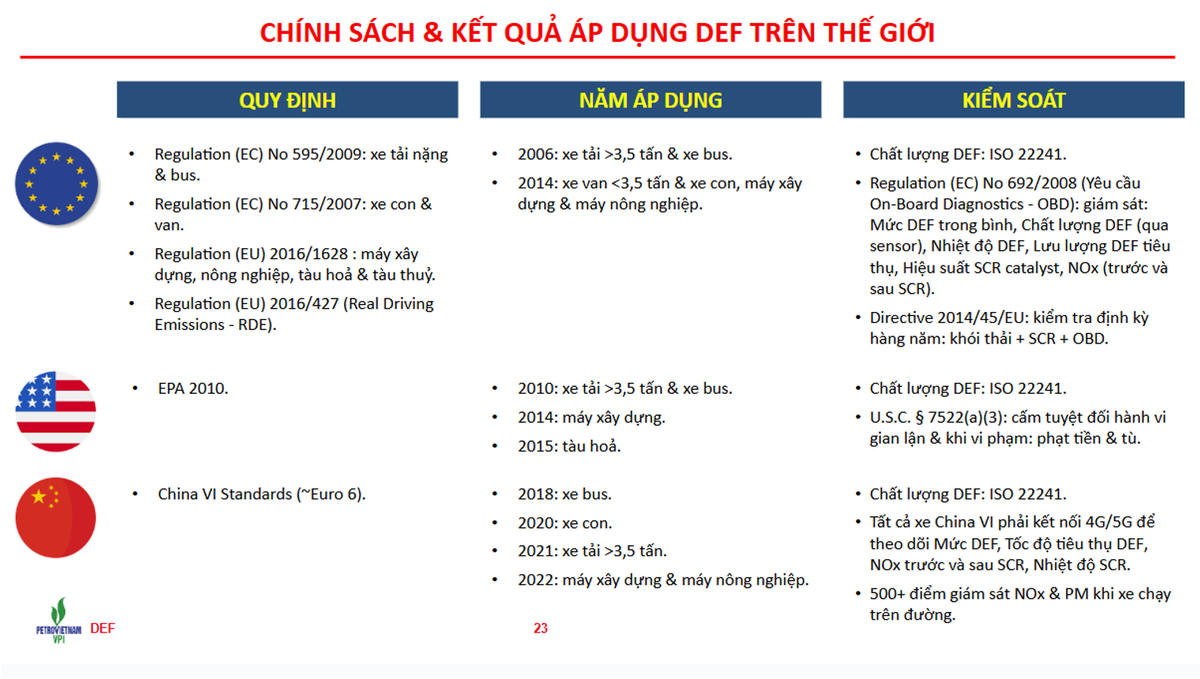 Châu Âu, Mỹ, Trung Quốc đều áp dụng giải pháp DEF theo quy trình quản lý chất lượng, kiểm soát định kỳ và thương xuyên nghiệm ngặt chỉ tiêu khói thải phương tiên. Như Trung Quốc yêu cầu tất cả các xe phải kết mạng để theo dõi mức DEF, tốc độ tiêu thụ DEF, NOx trước và sau SCR, nhiệt độ SCR… Thêm vào đó còn có 500 điểm giám sát NOx và PM khi phương tiện chạy trên đường.