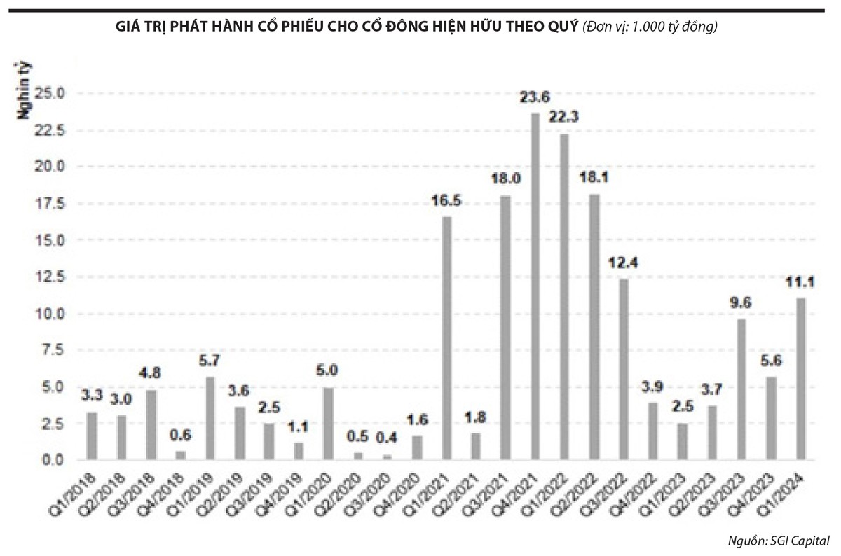 Năm 2023, huy động vốn thông qua chào bán cổ phiếu ra công chúng đạt 50.527 tỷ đồng, giảm mạnh so với con số 116.684 tỷ đồng năm 2022 và 102.500 tỷ đồng năm 2021.