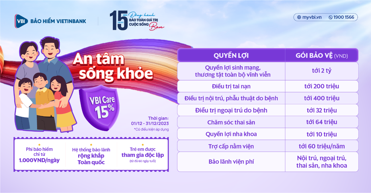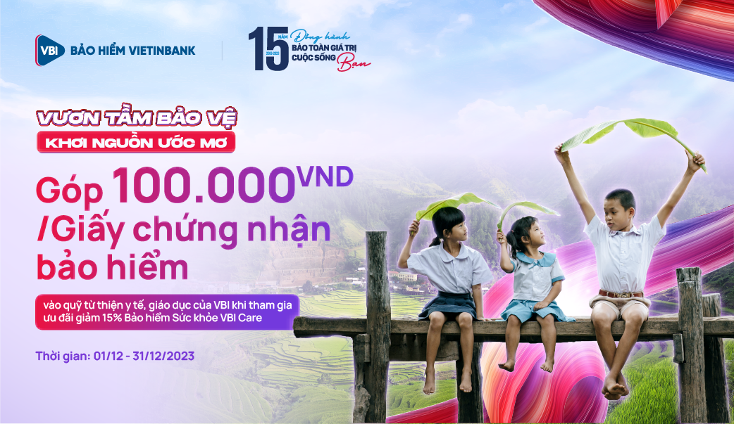 Nhân dịp sinh nhật 15 tuổi, từ ngày 1/12/2023 - 31/12/2023, VBI triển khai chương trình khuyến mãi ''Vươn tầm bảo vệ - Khơi nguồn ước mơ", ưu đãi vàng lên tới 15% sản phẩm Bảo hiểm Sức khỏe VBICare. Cụ thể, giảm ngay 10% cho 1 khách hàng tham gia; giảm ngay 15% từ 2 khách trở lên cùng tham gia trên 1 đơn bảo hiểm với khách hàng là người được bảo hiểm có độ tuổi từ 7-50 tuổi; khách hàng không tham gia bảo hiểm VBICare trong 2 năm kể từ ngày 01/01/2021.