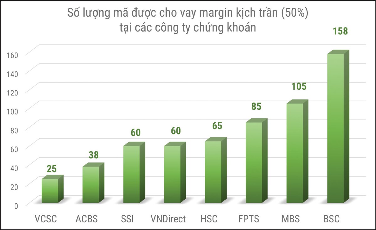 Tại Công ty cổ phần Chứng khoán Sài Gòn (SSI), hiện tại, Công ty đang có 60 mã chứng khoán cho vay kịch trần, với tỷ lệ ký quỹ 50% giá trị danh mục. Với Công ty cổ phần Chứng khoán TP.HCM (HSC), 65 trên 170 mã chứng khoán đang cho vay ở tỷ lệ này.
