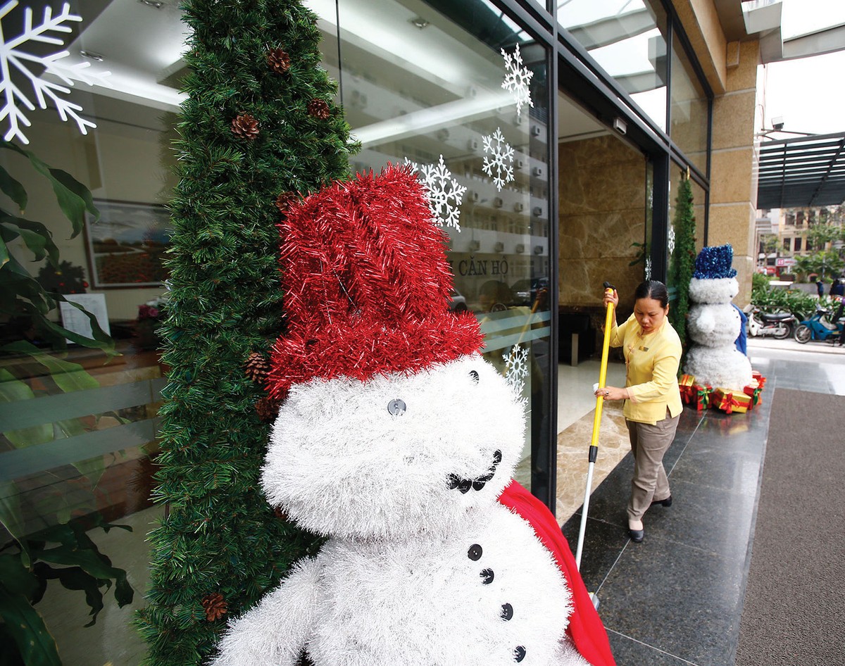 Những ngày này, nhiều tòa nhà tuyển các chú người tuyết làm người gác cửa vui nhộn