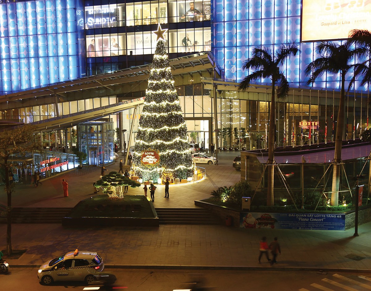 Những cây thông khổng lồ được trang trí đẹp mắt trước cửa các trung tâm thương mại lớn như Vincom, Royal City, Lotte… báo hiệu sẵn sàng cho ngày lễ Giáng sinh đang đến dần.