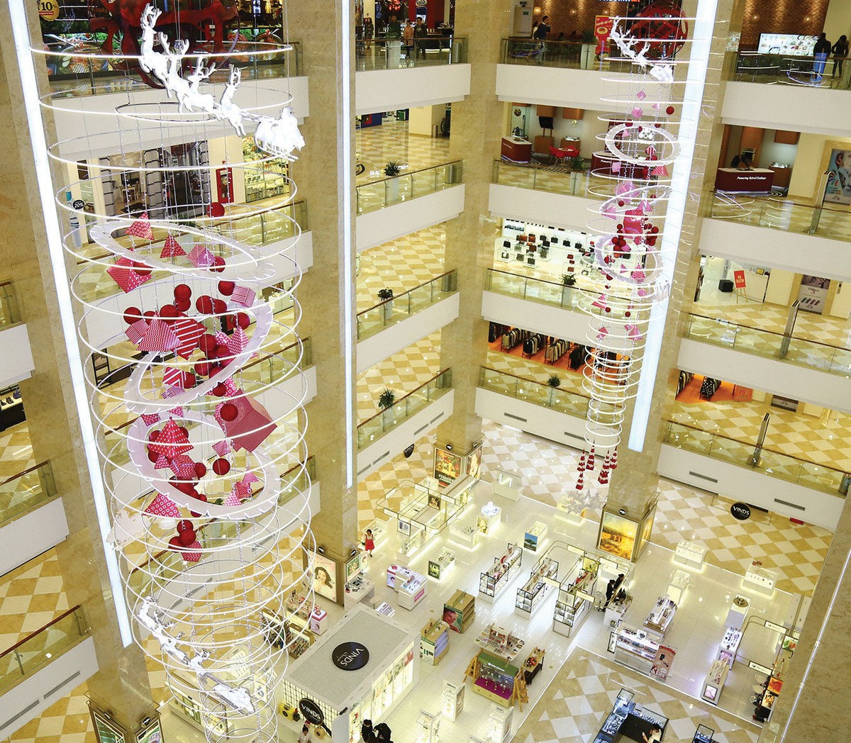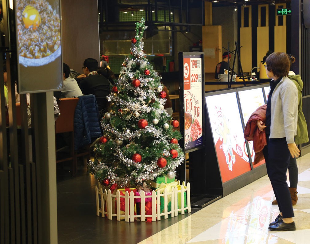 Trong các trung tâm thương mại, từ các cửa hàng quần áo đến những quán ăn hay quán cà phê cũng đều được trang trí lộng lẫy với màu xanh, đỏ, trắng - màu sắc đặc trưng của Giáng sinh. Mọi thứ đã sẵn sàng để chào đón mùa Giáng sinh an lành cho tất cả mọi người.