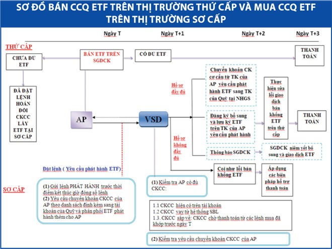 - Số lượng CCQ ETF/CKCC mà AP được nhận về do thực hiện giao dịch hoán đổi để bù cho số lượng CCQ ETF/CKCC còn thiếu phải về tài khoản của AP trước ngày thanh toán của giao dịch bán CCQ ETF/CKCC trên Sở GDCK nêu trên ít nhất 1 ngày làm việc.