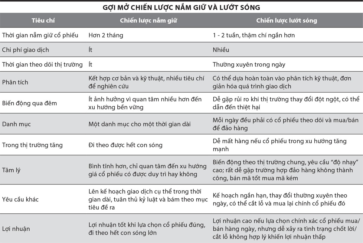 Nhìn về các tiêu chí so sánh, chiến lược nắm giữ đang chiếm ưu thế khi đáp ứng được nhiều nhu cầu của nhà đầu tư khi chứng khoán vẫn là một kênh đầu tư hấp dẫn và là kênh đầu tư “tay trái” của không ít người, có khả năng đạt mục tiêu lợi nhuận đề ra.