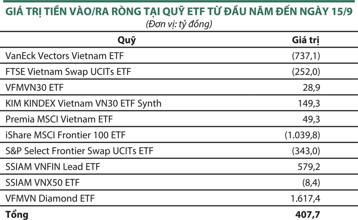 Về diễn biến dòng vốn các quỹ ETF, từ đầu năm đến ngày 15/9, có quỹ hút vốn ròng, nhưng có quỹ bị rút vốn, tính chung các quỹ huy động thêm hơn 400 tỷ đồng. Đáng chú ý, hai quỹ mới là VFMVN Diamond ETF và SSIAM VNFin Lead ETF lần lượt huy động được 1.617 tỷ đồng và 579 tỷ đồng.